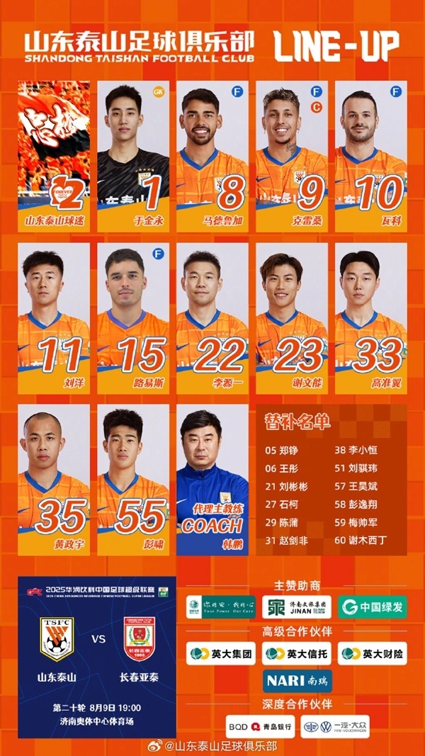 8月9日19点,在中超第20轮的一场比赛中,山东泰山坐镇主场迎战“副班长”长春亚泰,这场也是韩鹏履新教练组组长的“满月”之战。比赛第39分钟,高准翼助攻,瓦科头球破门。第53分钟,谢文能助攻,陈蒲小角度凌空斩破门。第69分钟,卡米洛凭借个人能力扳回一球。第88分钟,高准翼被改判红牌罚下。最终,泰山2比1险胜亚泰,韩鹏执教前四场比赛两胜两负。